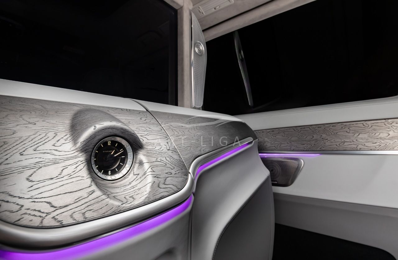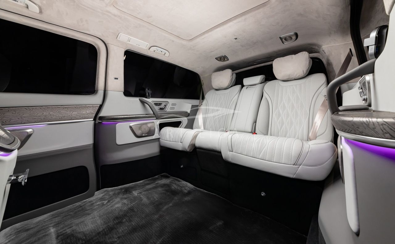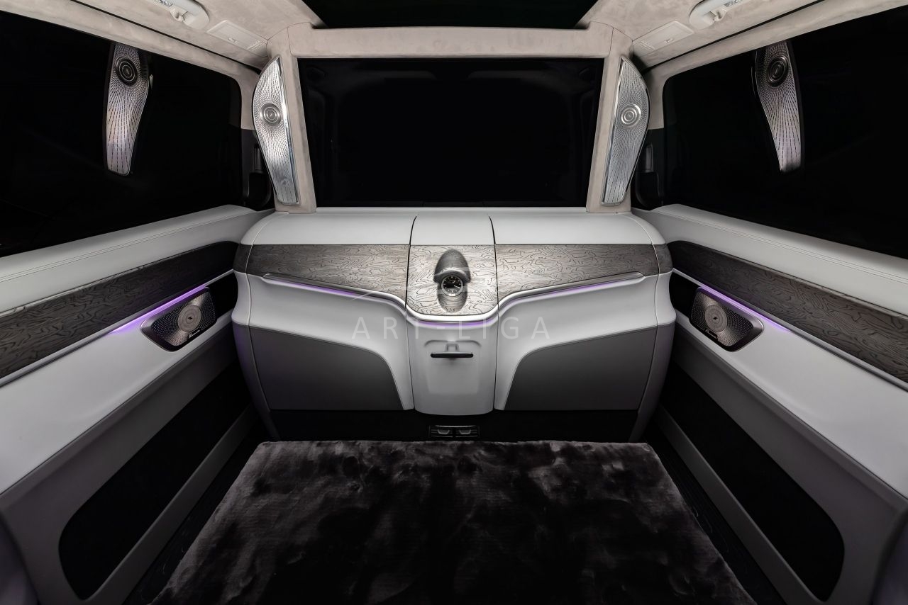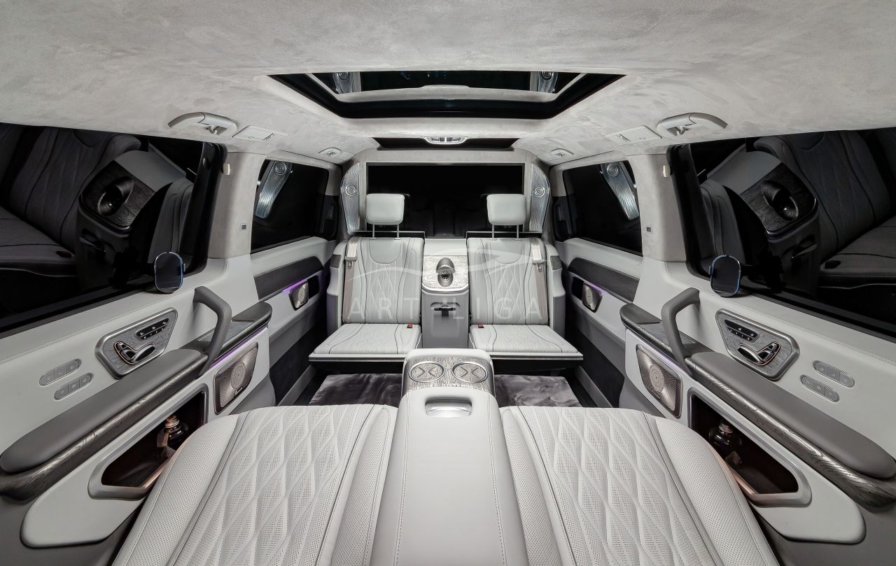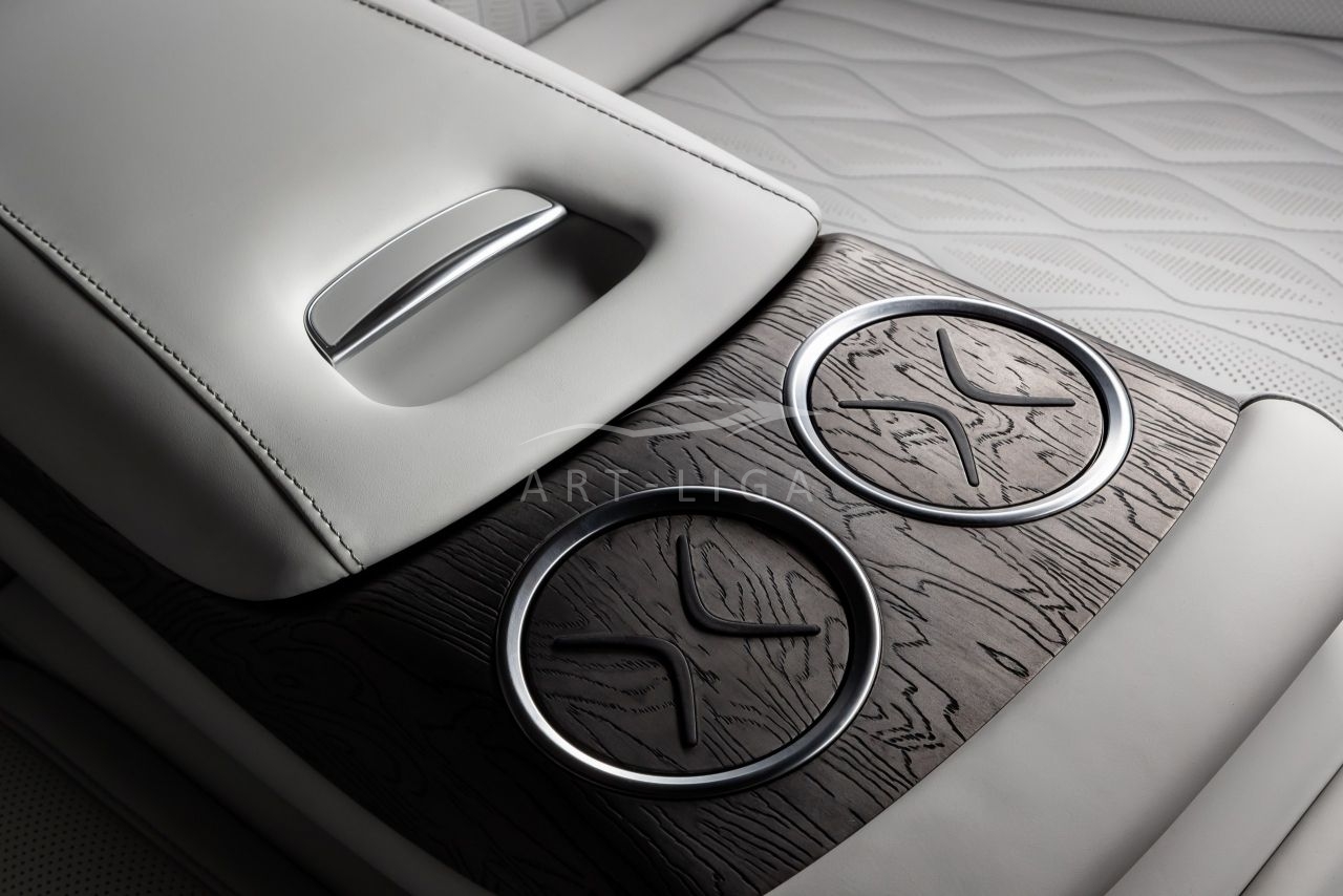 В салоне появилась новая перегородка с системой подъема стекла, обновленные боковые панели, панорамный люк, модернизированные кресла и диван от Mercedes Maybach, качественная акустика и продуманная подсветка. Мы уделили внимание каждому элементу салона и постарались сделать его удобным, красивым и функциональным.