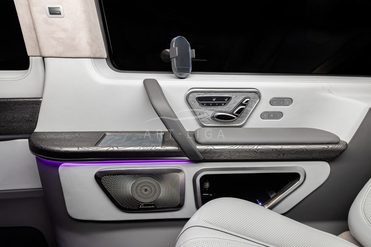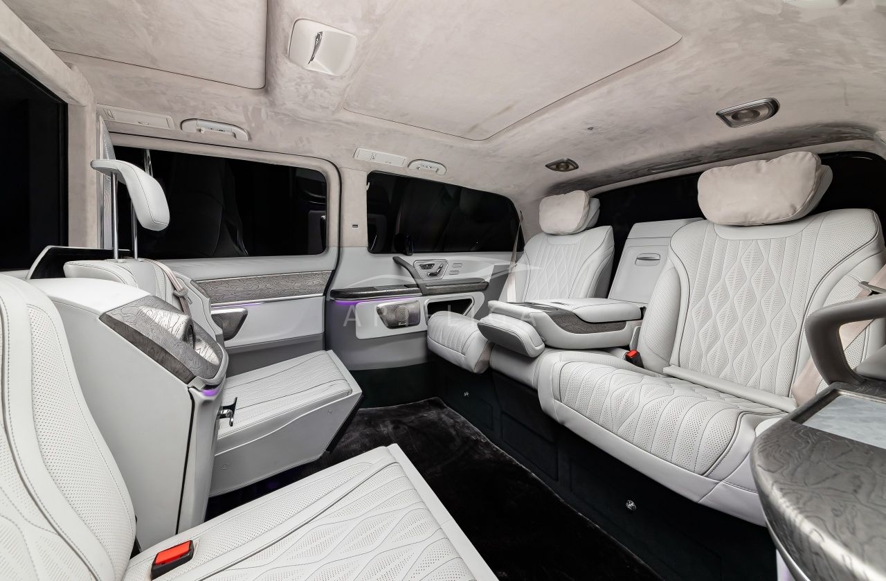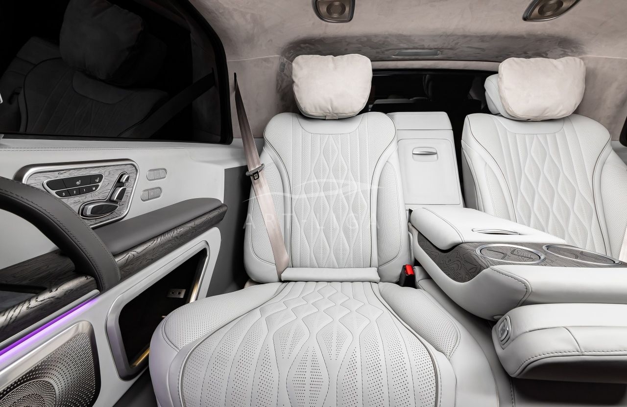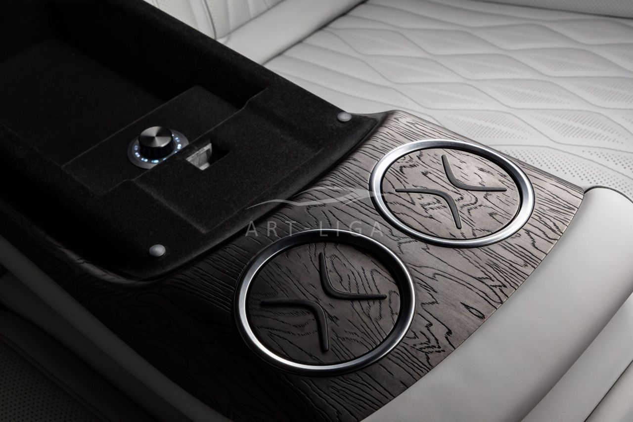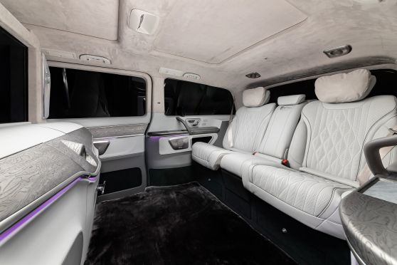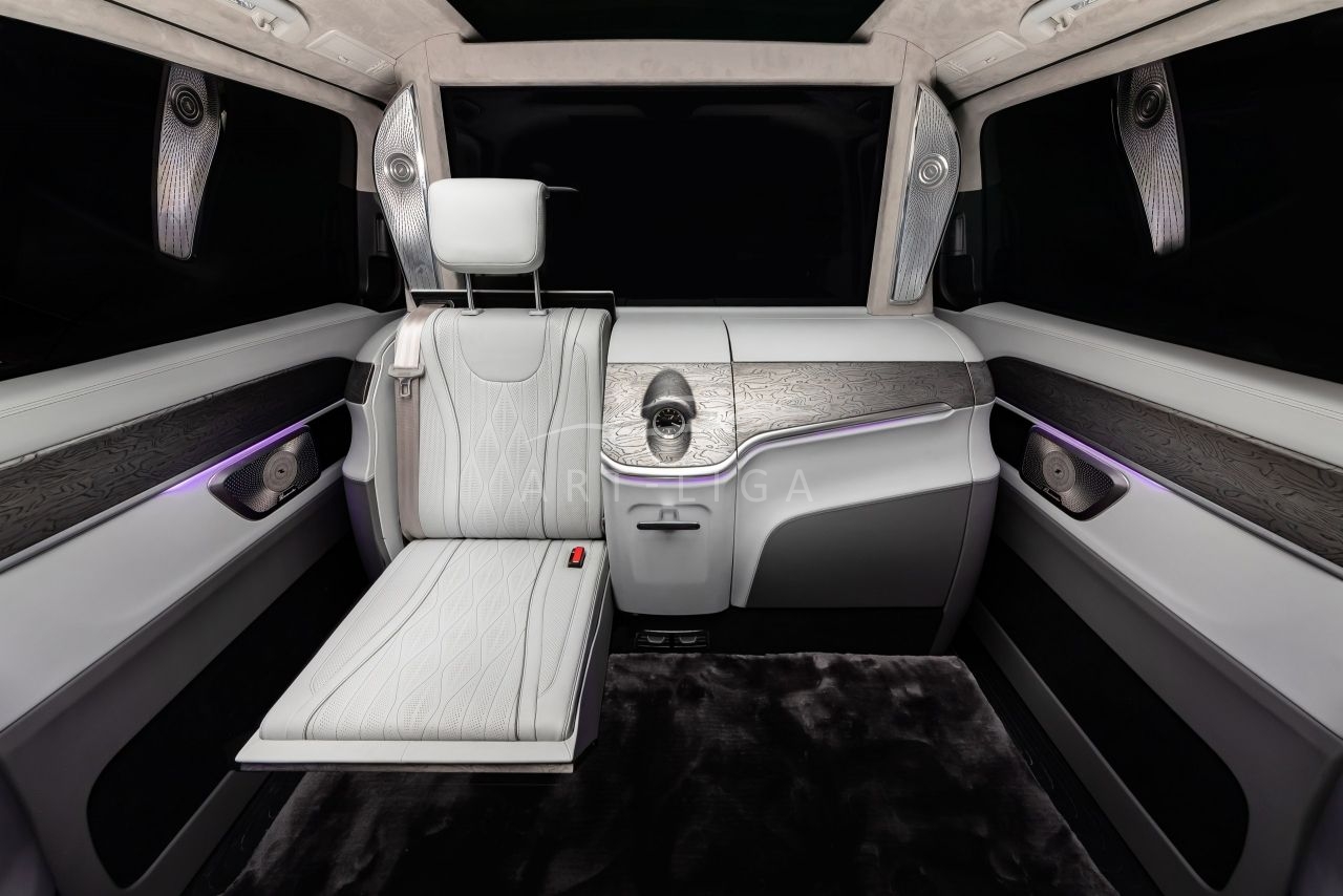 В салоне появилась новая перегородка с системой подъема стекла, обновленные боковые панели, панорамный люк, модернизированные кресла и диван от Mercedes Maybach, качественная акустика и продуманная подсветка. Мы уделили внимание каждому элементу салона и постарались сделать его удобным, красивым и функциональным.