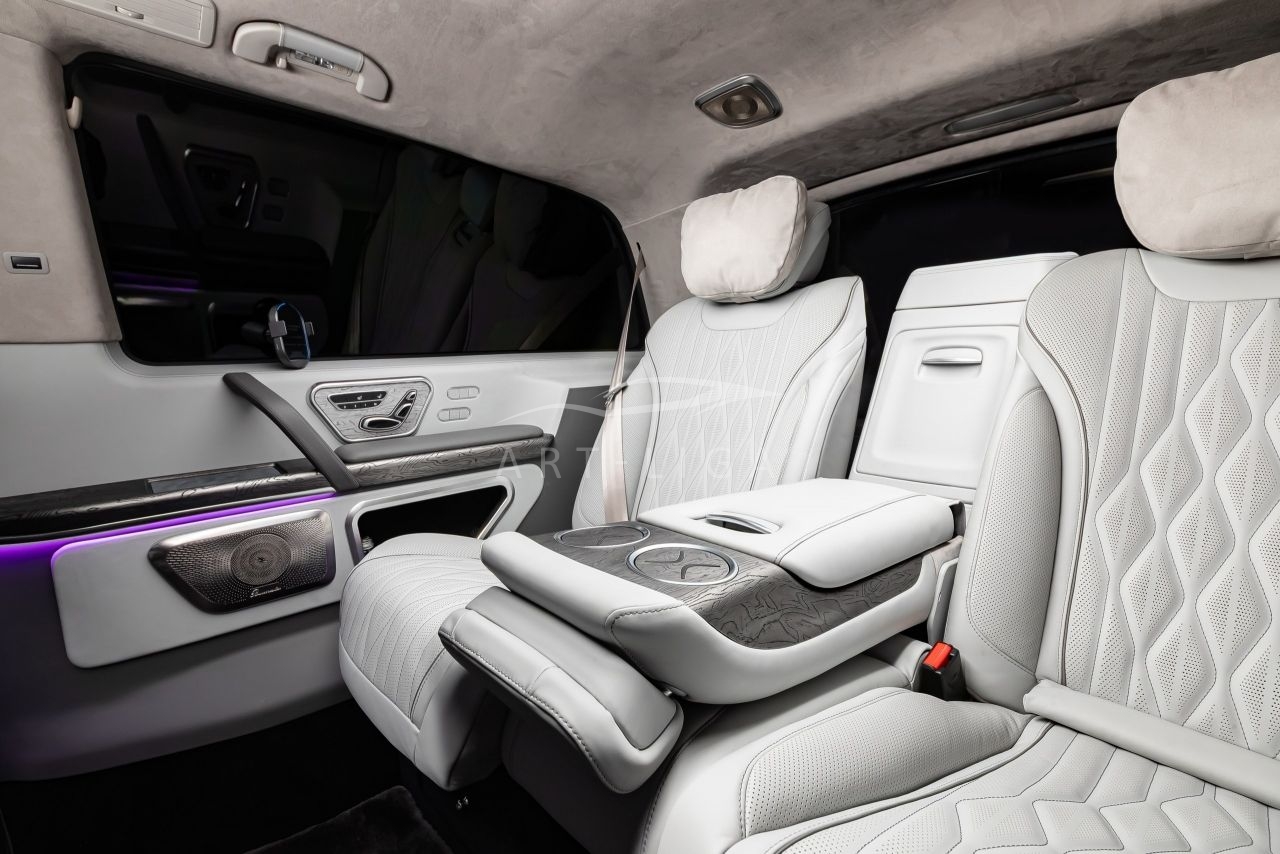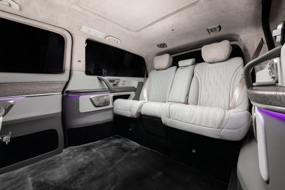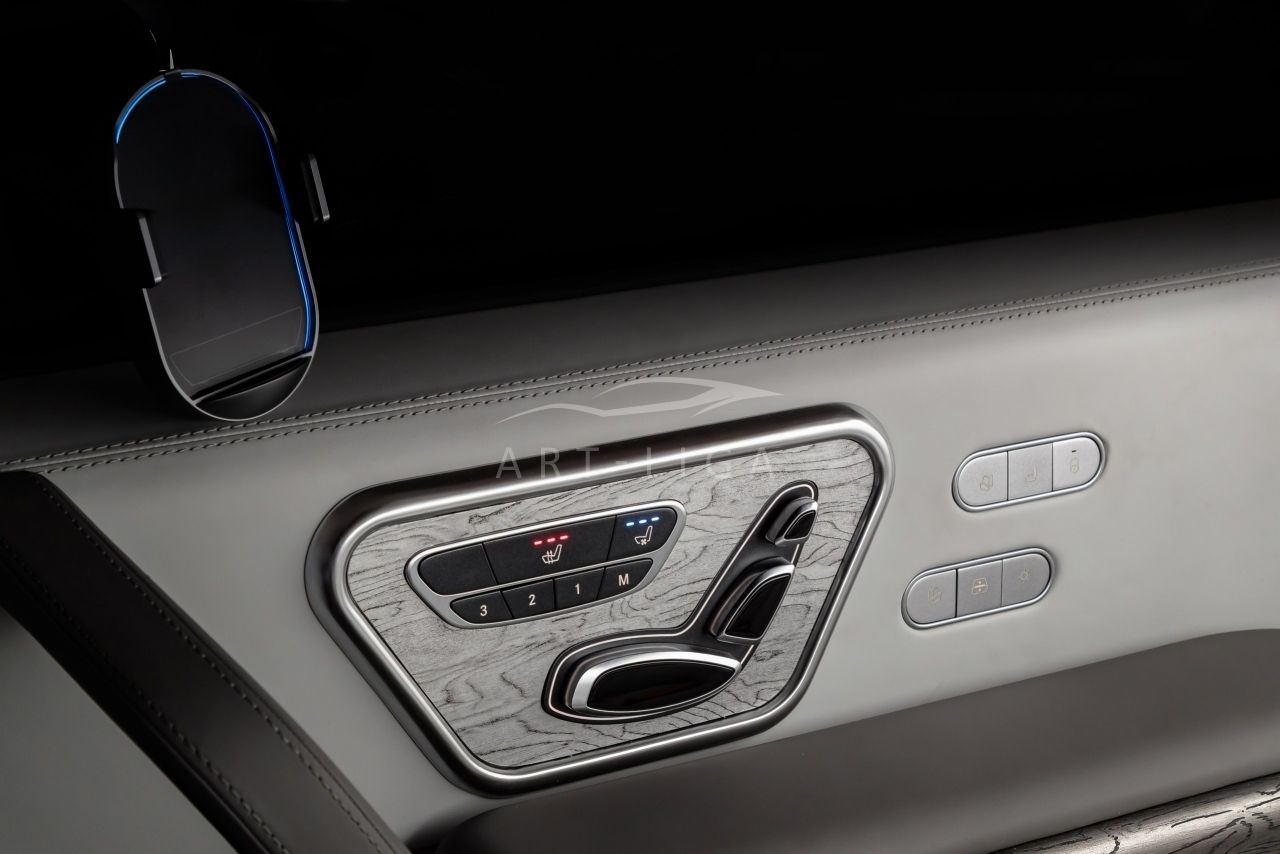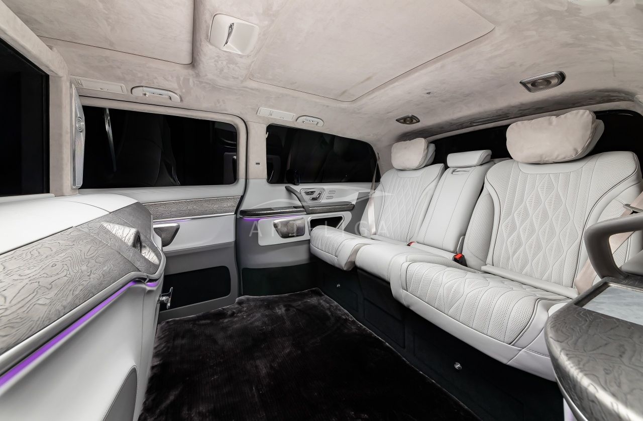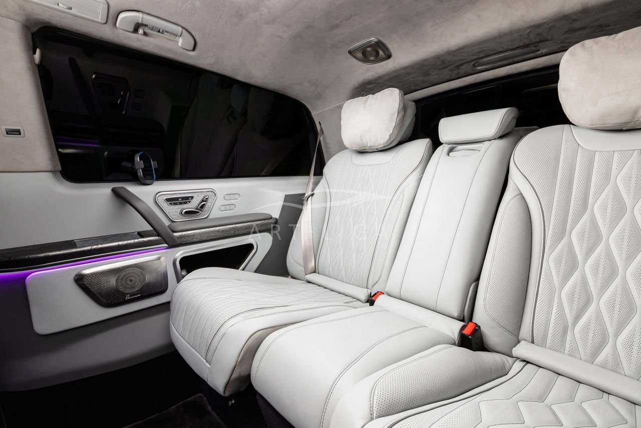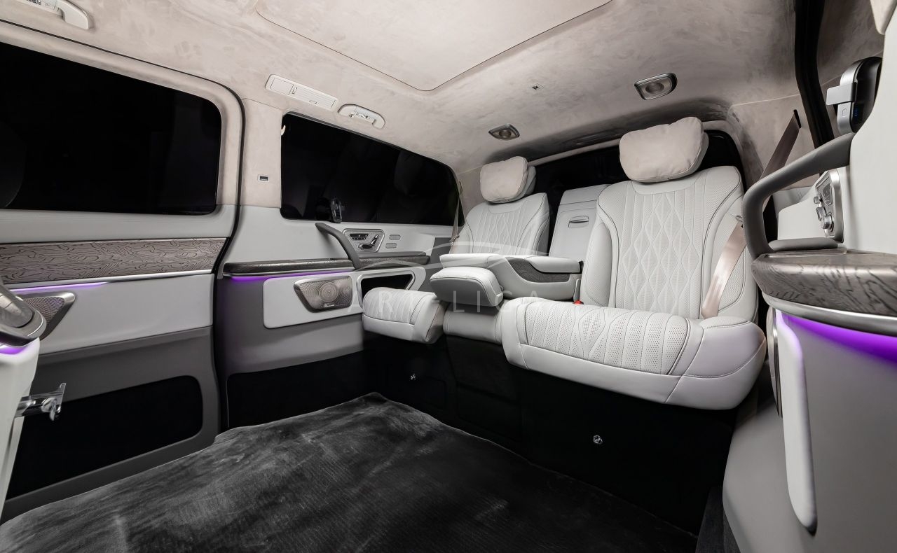В салоне появилась новая перегородка с системой подъема стекла, обновленные боковые панели, панорамный люк, модернизированные кресла и диван от Mercedes Maybach, качественная акустика и продуманная подсветка. Мы уделили внимание каждому элементу салона и постарались сделать его удобным, красивым и функциональным.