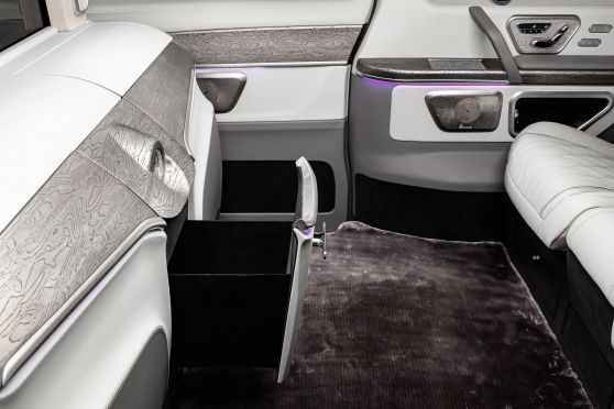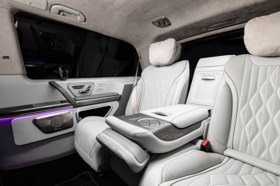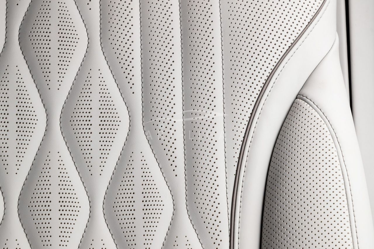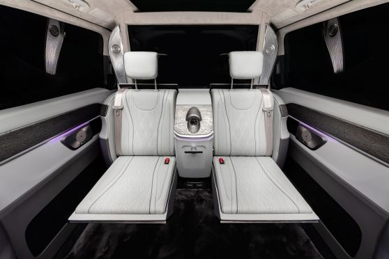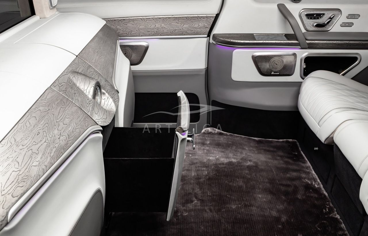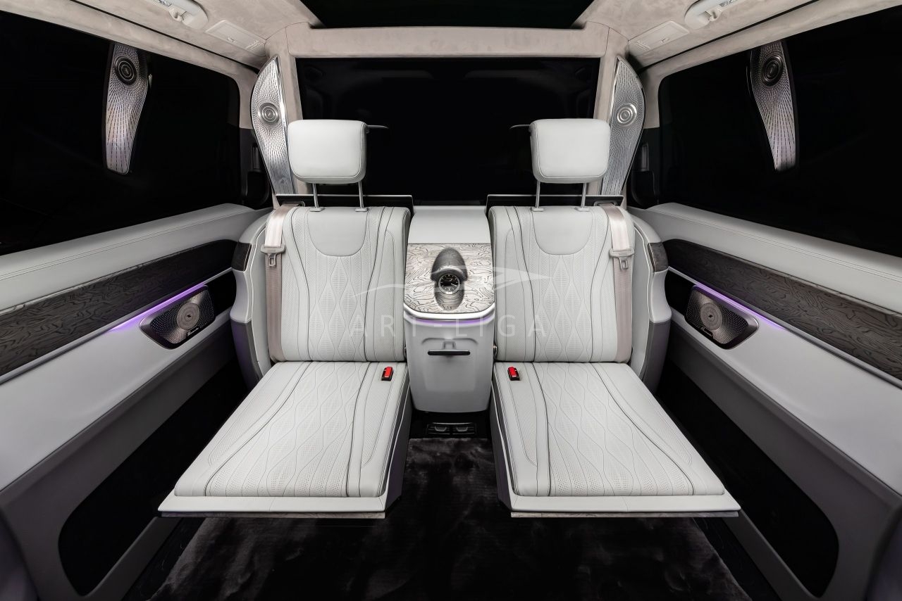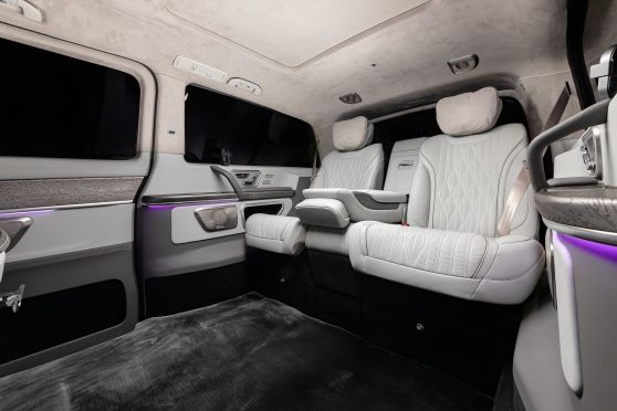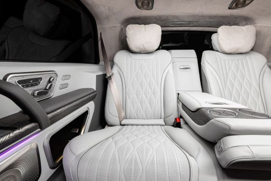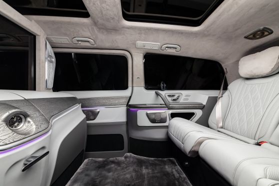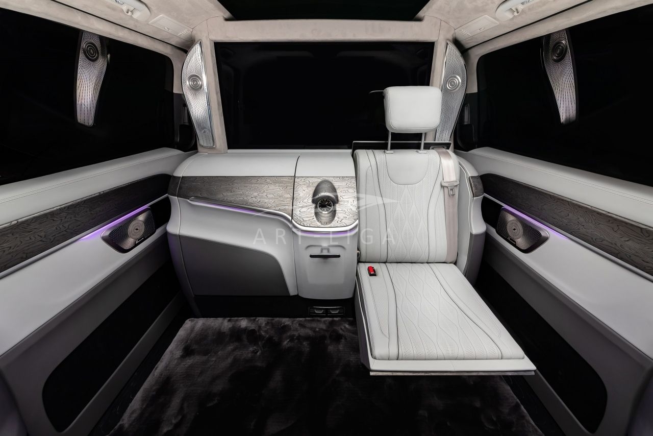 В салоне появилась новая перегородка с системой подъема стекла, обновленные боковые панели, панорамный люк, модернизированные кресла и диван от Mercedes Maybach, качественная акустика и продуманная подсветка. Мы уделили внимание каждому элементу салона и постарались сделать его удобным, красивым и функциональным.